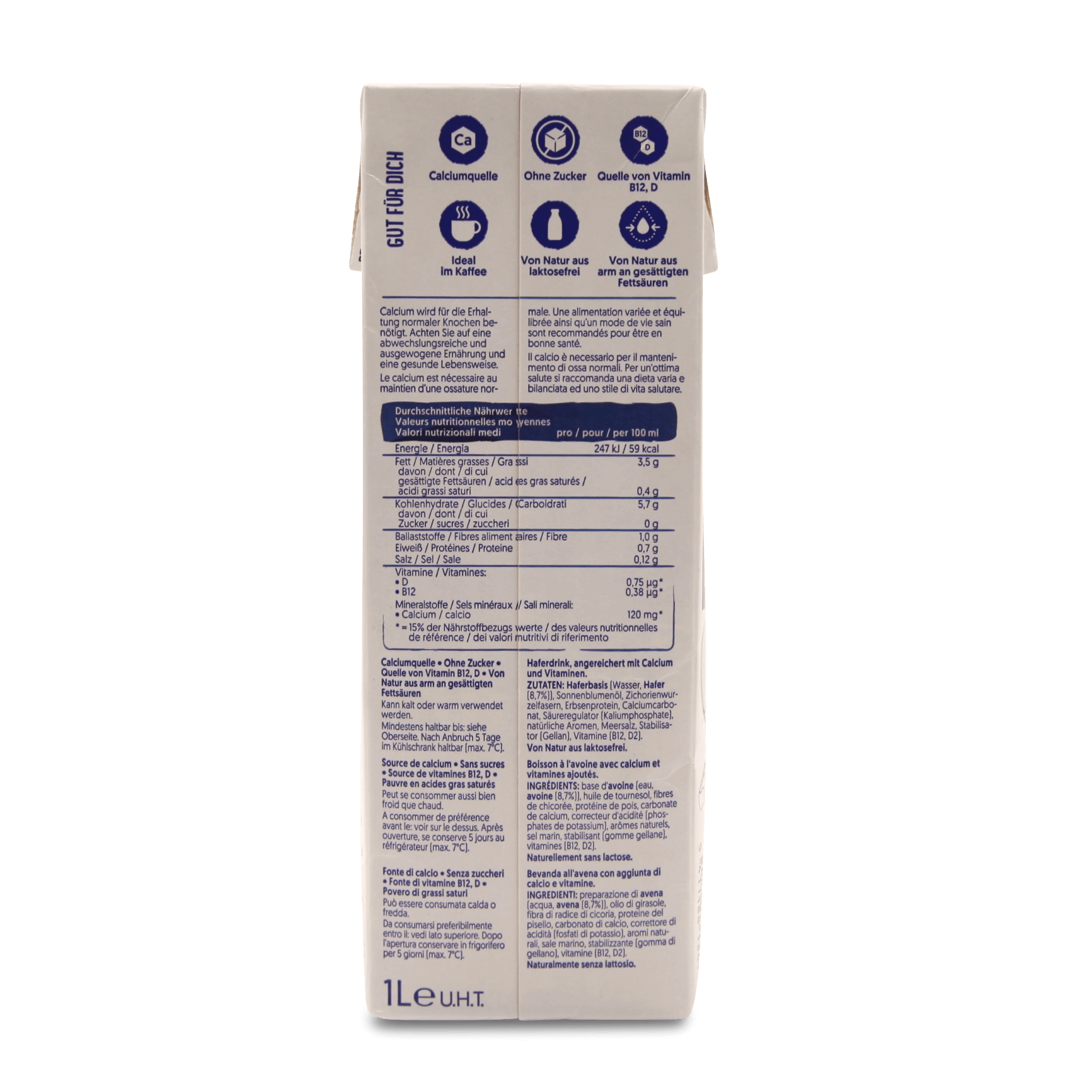 HAFERBASIS (Wasser, HAFER 8,7%), Sonnenblumenöl, Zichorienwurzelfaser, Erbsenprotein, Calciumcarbonat, Säureregulator: Kaliumphosphate; natürliche Aromen, Meersalz, Stabilisator: Gellan; Vitamine (B12, D2). Kann Spuren von Schalenfrüchten (keine Erdnüsse) enthalten.Von Natur aus laktosefrei.