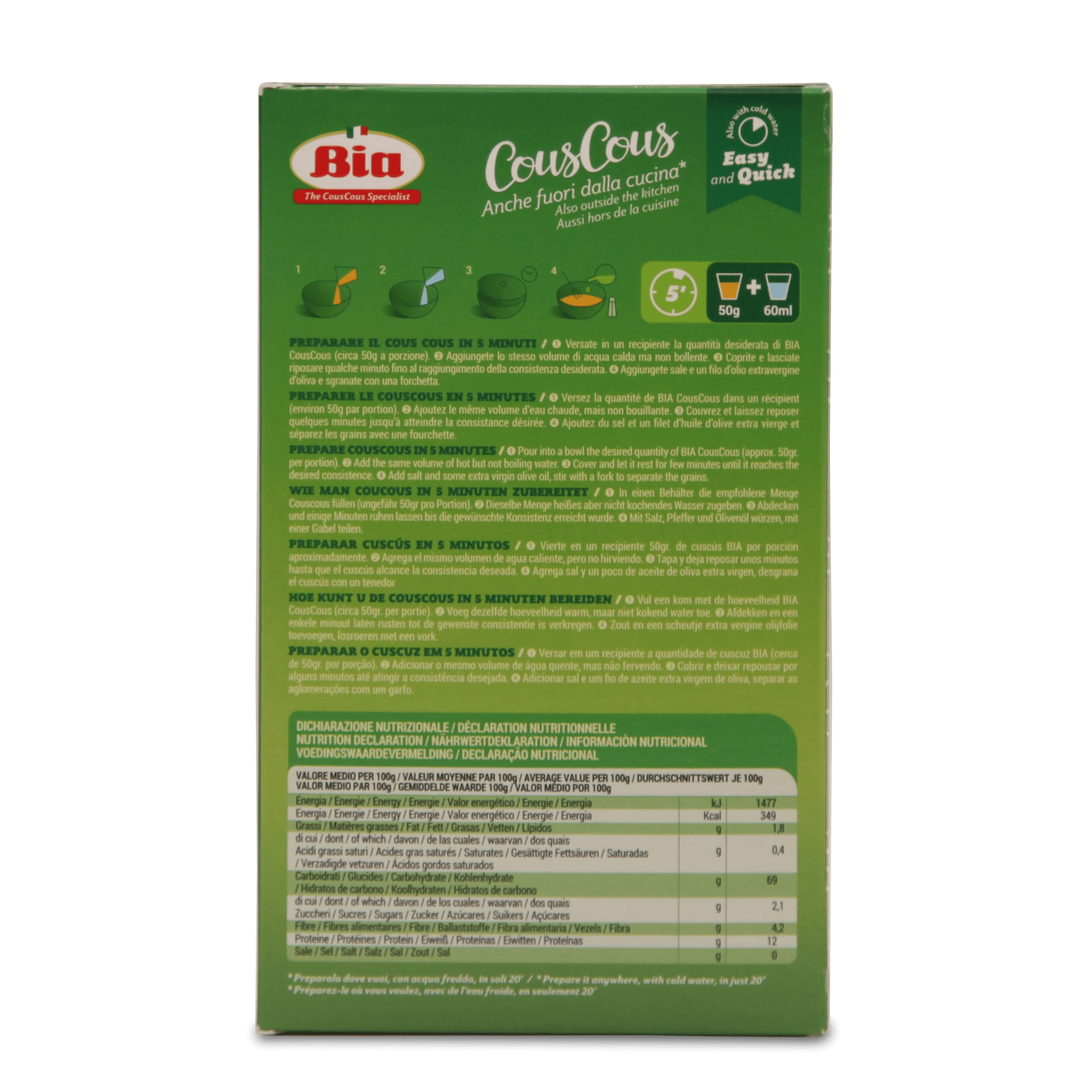 Es geht aber auch sehr viel einfacher: Unser Couscous muss nur mit heißem Salzwasser oder Brühe übergossen werden und etwa 10 Minuten quellen. Mit der Gabel auflockern und etwas Butter oder Olivenöl zufügen. Blitzschnell ist eine köstliche Beilage fertig. Außerdem eignet sich Couscous zum Füllen von Gemüse, als Salatgrundlage, z. B. für Taboulé, als Suppeneinlage und für Süßspeisen.