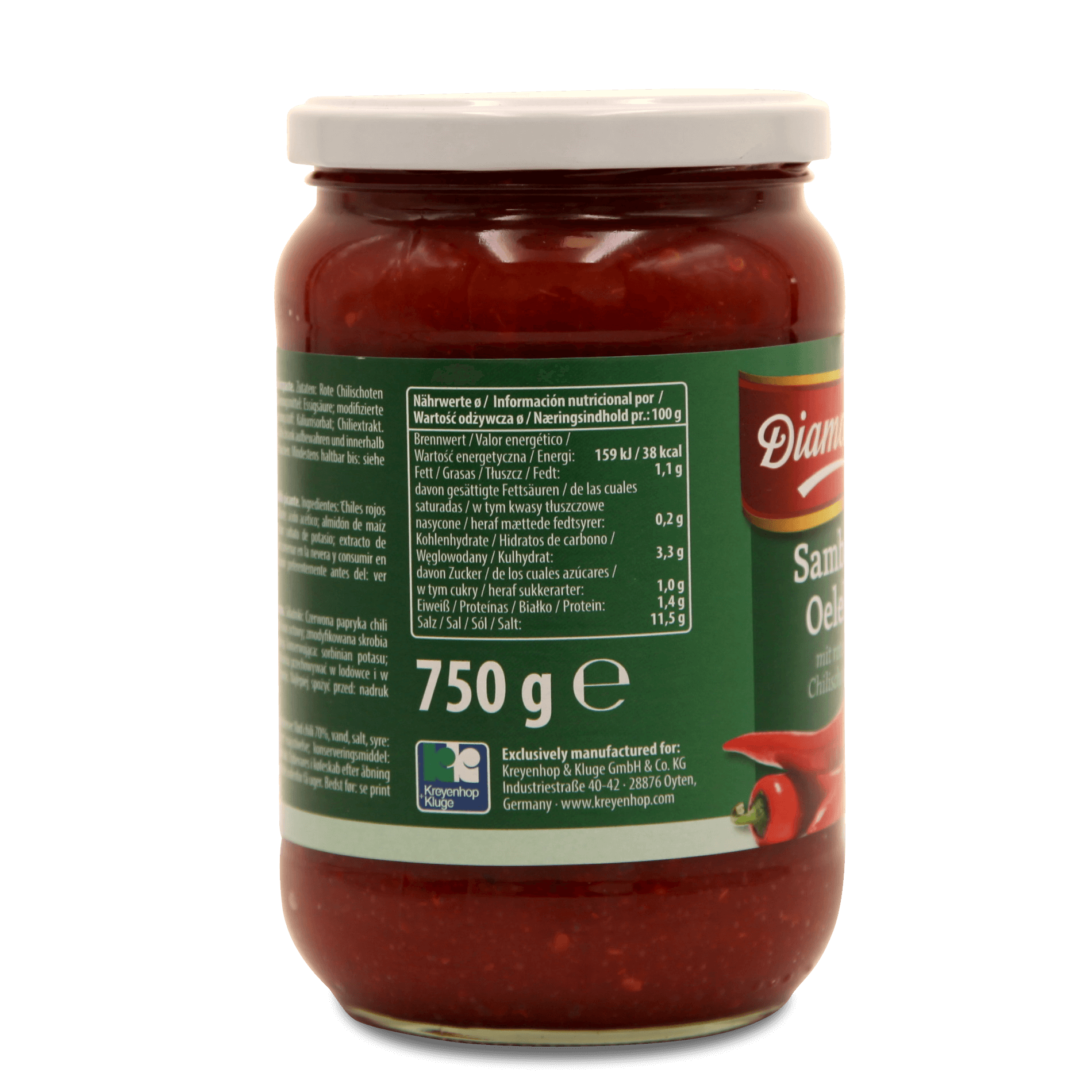 Rote Chilischoten 70%, Wasser, Salz, Säuerungsmittel: E260 Essigsäure; Modifizierte Maisstärke, Konservierungsstoff: E202 Kaliumsorbat