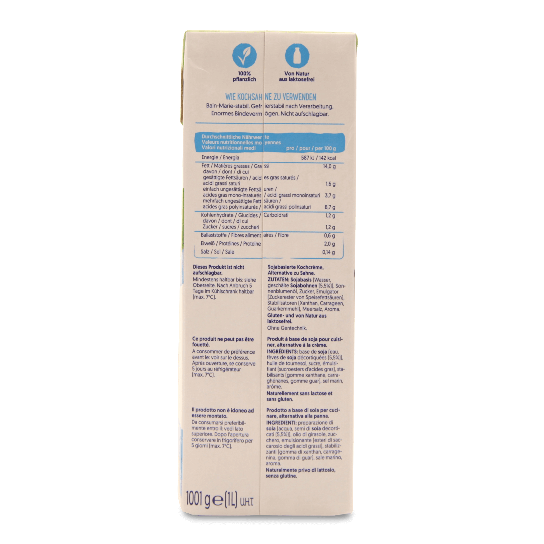 SOJABASIS (Wasser, geschälte SOJABOHNEN 5,5%), Sonnenblumenöl, Zucker, Emulgator: Zuckerester vonSpeisefettsäuren; Stabilisatoren: Xanthan, Carrageen, Guarkernmehl; Meersalz, Aroma. Von Natur aus gluten-, und kuhmilcheiweißfrei. Von Natur aus laktosefrei.