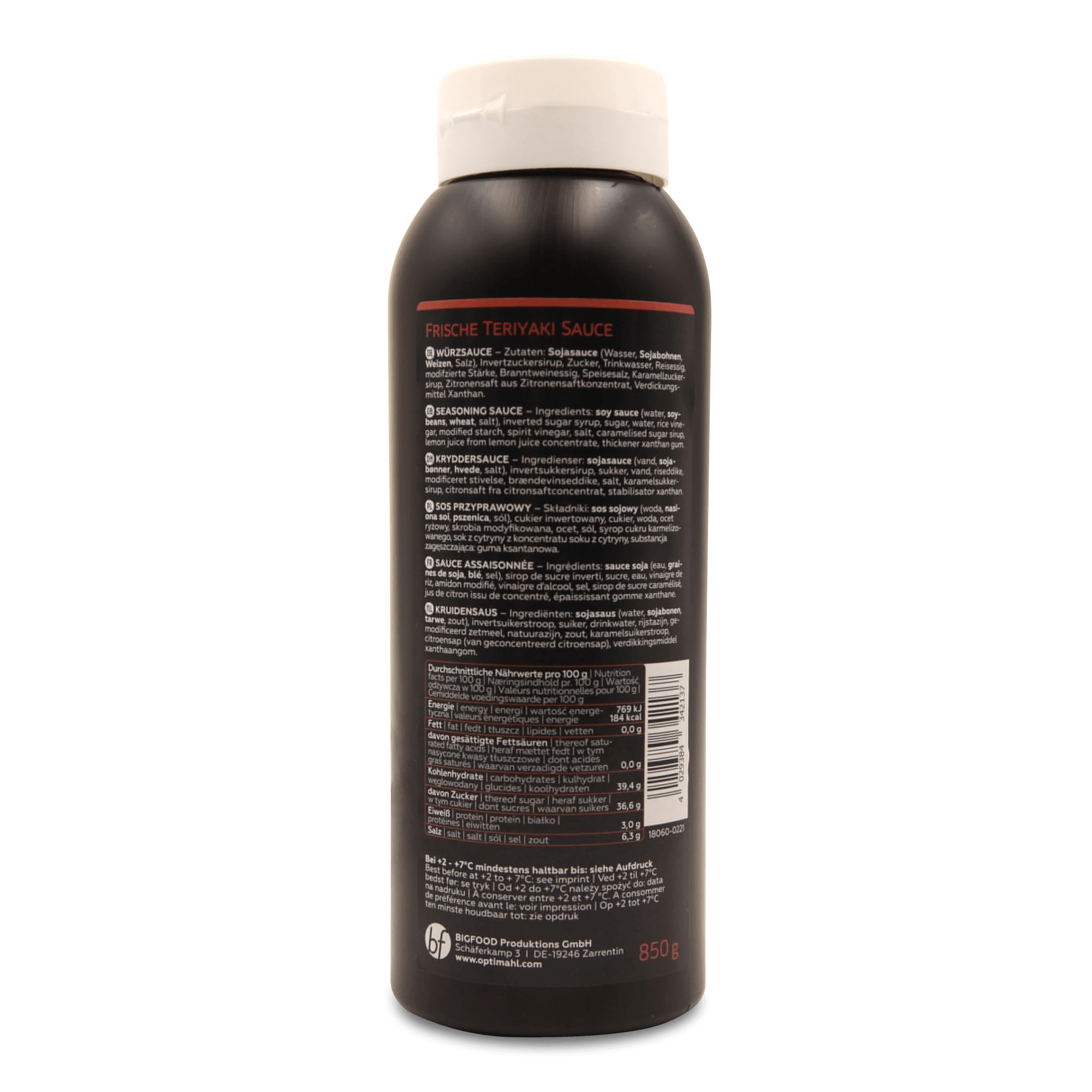 SOJASAUCE (Wasser, SOJABOHNEN, WEIZEN, Salz), Invertzuckersirup, Trinkwasser, Zucker, Reisessig, modifizierte Stärke, Branntweinessig, Karamellzuckersirup, Zitronensaft, Verdickungsmittel: E415 Xanthan