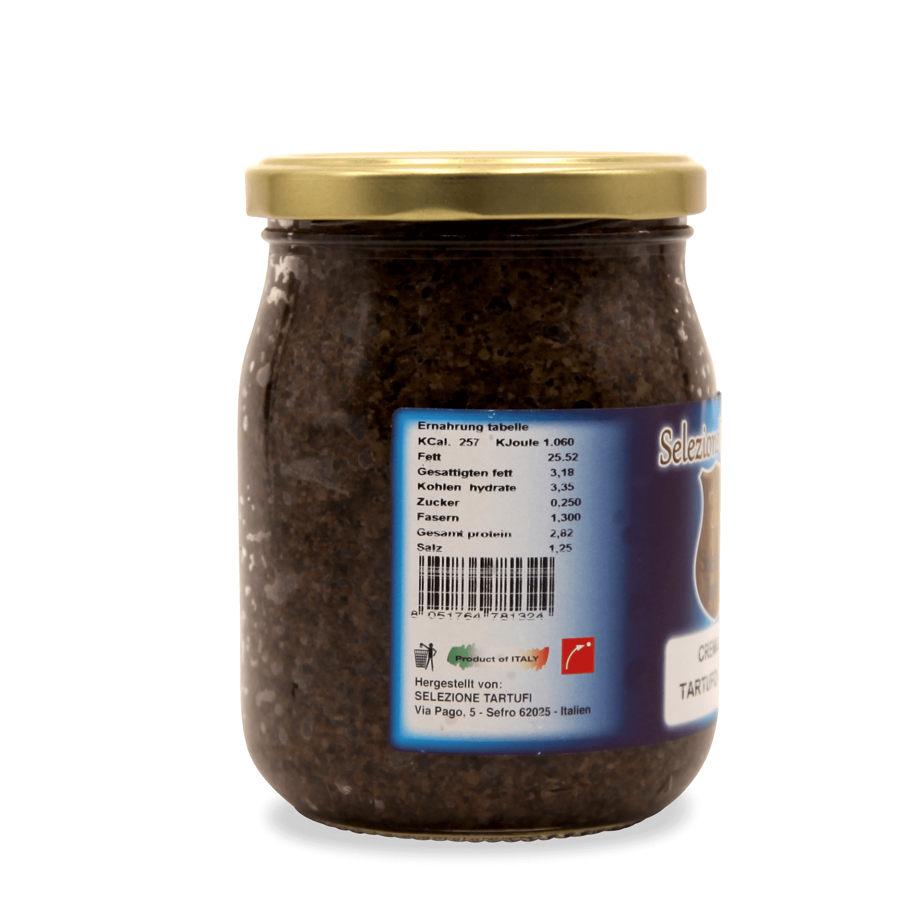 Champignons (Agricus bisporus) 50 %, Olivenöl, Oliven 12 %, schwarze Trüffel (Tuber Aestivum) 12 %, weiße Trüffel (Tuber Magnatum) 3 %, Aroma, Salz, Pfeffer